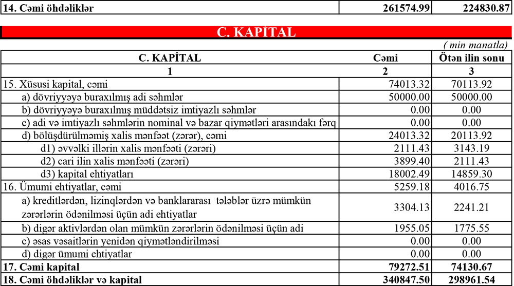 Xatırladaq ki, 2020-ci ilin 9 ayında “Ziraat Bank Azərbaycan”ın cəmi əməliyyat gəlirləri (faiz və qeyri-faiz xərcləri) 17 milyon 342 min manat, cəmi əməliyyat xərcləri (faiz və qeyri-faiz xərcləri) 11 milyon 660 min manat, faiz borcları üzrə yaradılmış məqsədli ehtiyatlar 1 milyon 207 min manat, gəlirlər xərcləri üstələdiyindən əməliyyat mənfəəti 4 milyon 475 min manat təşkil etmişdi. Bank əməliyyat mənfəətindən 2 milyon 232 min manat aktivlər üzrə mümkün zərərlərin ödənilməsi üçün xüsusi ehtiyatın yaradılmasına ayırmış, 303 min manat mənfəət vergisi ödəmişdi. Nəticədə, "Ziraat Bank Azərbaycan" ASC həmin dövrü 1 milyon 940 min manat xalis mənfəət ilə bağlamışdı.