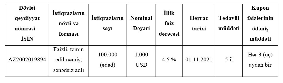 Hərrac zamanı hər birinin nominal dəyəri 1000 dollar olan 100 min ədəd istiqraz təklif olunacaqdır. Tədavül müddəti 5 il olan istiqrazlar üzrə təklif olunan gəlir illik 4,5%-dir. Faiz hər üç aydan bir ödəniləcəkdir.
