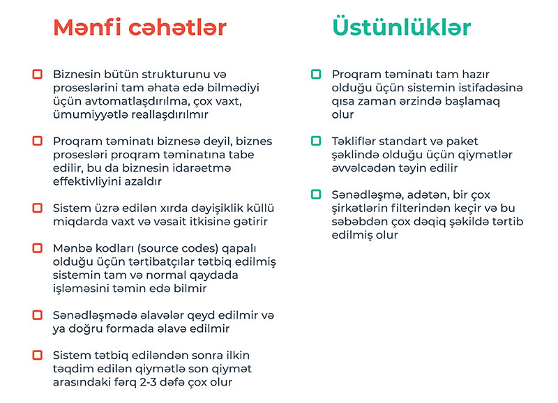 Bu tip həllər öz populyarlığını ötən əsrin sonlarında qazanmışdı. Buna səbəb şirkətlərin şəxsi informasiya sistemini yaratmasından imtina edib daha qənaətcil və çevik həlləri axtarması olmuşdu. Bu cür biznes idarəetmə sistemləri praktik, sərfəli və rahat olsa da, bugünkü gündə bu cür biznes həllərindən imtina edən şirkətlərin sayı getdikcə artmaqdadır. Gəlin hazır “qutu” həllərinin müsbət və mənfi cəhətlərinə nəzər yetirək: