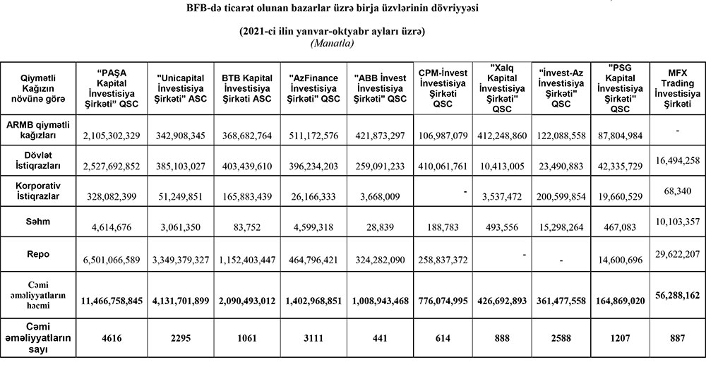 2021-ci ilin yanvar-oktyabr ayları üzrə Bakı Fond Birjasında ticarət olunan bazarlar üzrə birja üzvlərinin dövriyyəsi açıqlanıb.