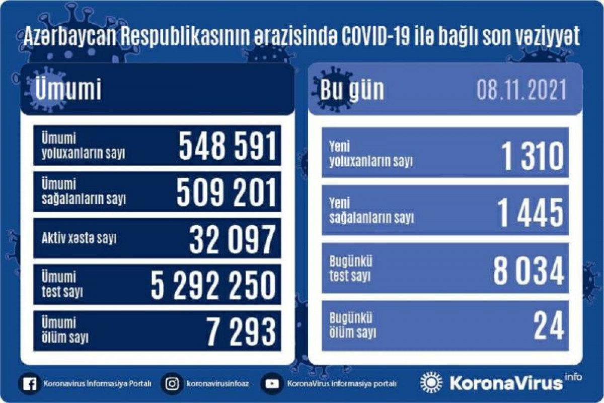 Azərbaycanda koronavirus (COVID-19) infeksiyasına 1310 yeni yoluxma faktı qeydə alınıb.