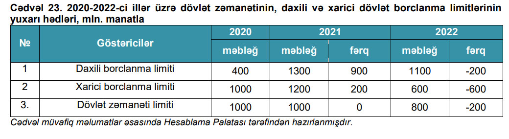 Dövlət büdcəsinin layihəsində 2022-ci il üçün Azərbaycan Respublikasının daxili borclanmasının yuxarı həddi 1 milyard 100 milyon manat, xarici borclanmanın yuxarı həddi 600 milyon manat, dövlət zəmanətlərinin məbləğinin yuxarı həddi isə 800 milyon manat məbləğində müəyyən edilmişdir. Növbəti ildə xarici borclanma üzrə limitin 50,0%, daxili borclanma üzrə limitin 15,4% azaldılması nəzərdə tutulmuşdur.