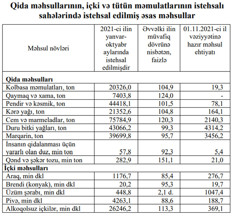 Hesabatda qeyd edilib ki, bu sahələrin əsas məhsullarından qənd və şəkər tozunun istehsalı 51,1 faiz, kolbasa məmulatlarının istehsalı 4,9 faiz, kərə yağının istehsalı 4,8 faiz artmış, duru bitki yağlarının istehsalı 0,7 faiz, marqarin istehsalı isə 4,3 faiz azalmışdır.