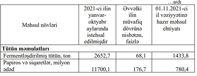 2021-ci ilin yanvar-oktyabr aylarında əvvəlki ilin müvafiq dövrü ilə müqayisədə tütün məmulatlarının istehsalında 56,1 faiz, qida məhsullarının istehsalında 10,9 faiz, içki istehsalında isə 1,6 faiz artım müşahidə olunmuşdur.
