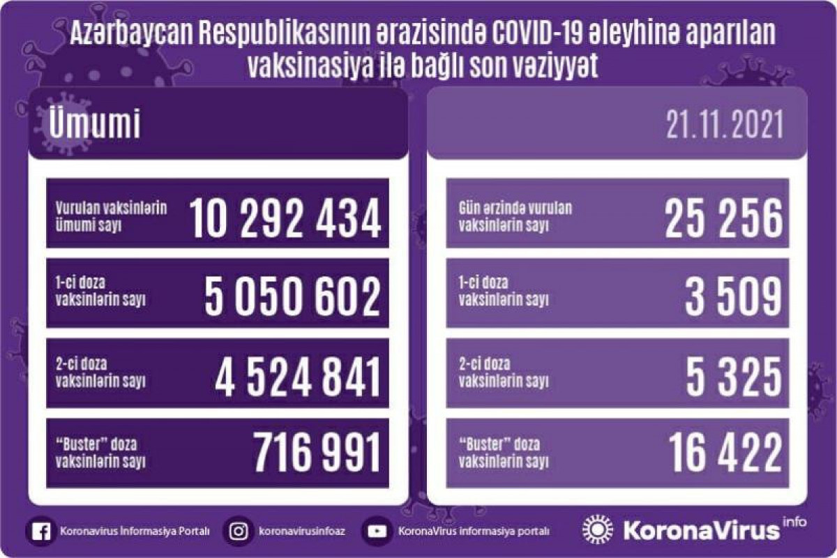 Bir gündə birinci mərhələ üzrə vaksinasiya olunanların sayı 3 509, ikinci mərhələ üzrə vaksinasiya olunanların sayı 5 325, "buster" doza üzrə vaksinasiya olunanların sayı isə 16 422 nəfərdir.