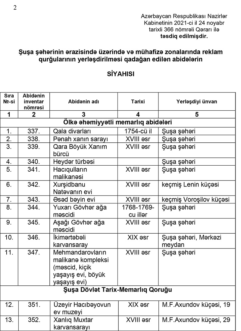 Şuşa şəhərinin ərazisində üzərində və mühafizə zonalarında reklam qurğularının yerləşdirilməsi qadağan edilən abidələrin siyahısı təsdiqlənib.