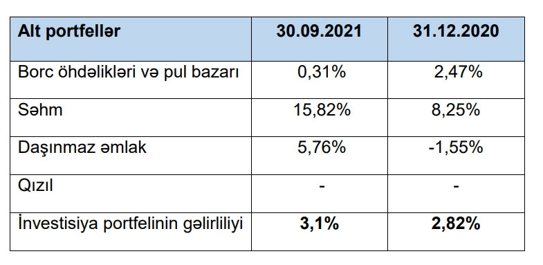 2021-ci ilin 9 ayı üzrə ARDNF-nin investisiya portfelinin gəlirliliyi 3,1% təşkil etmişdir ki, bu nəticə də ötən ilin göstəricisi (31.12.2020-ci il üzrə 2,82%) ilə müqayisədə 0,19% artmışdır.