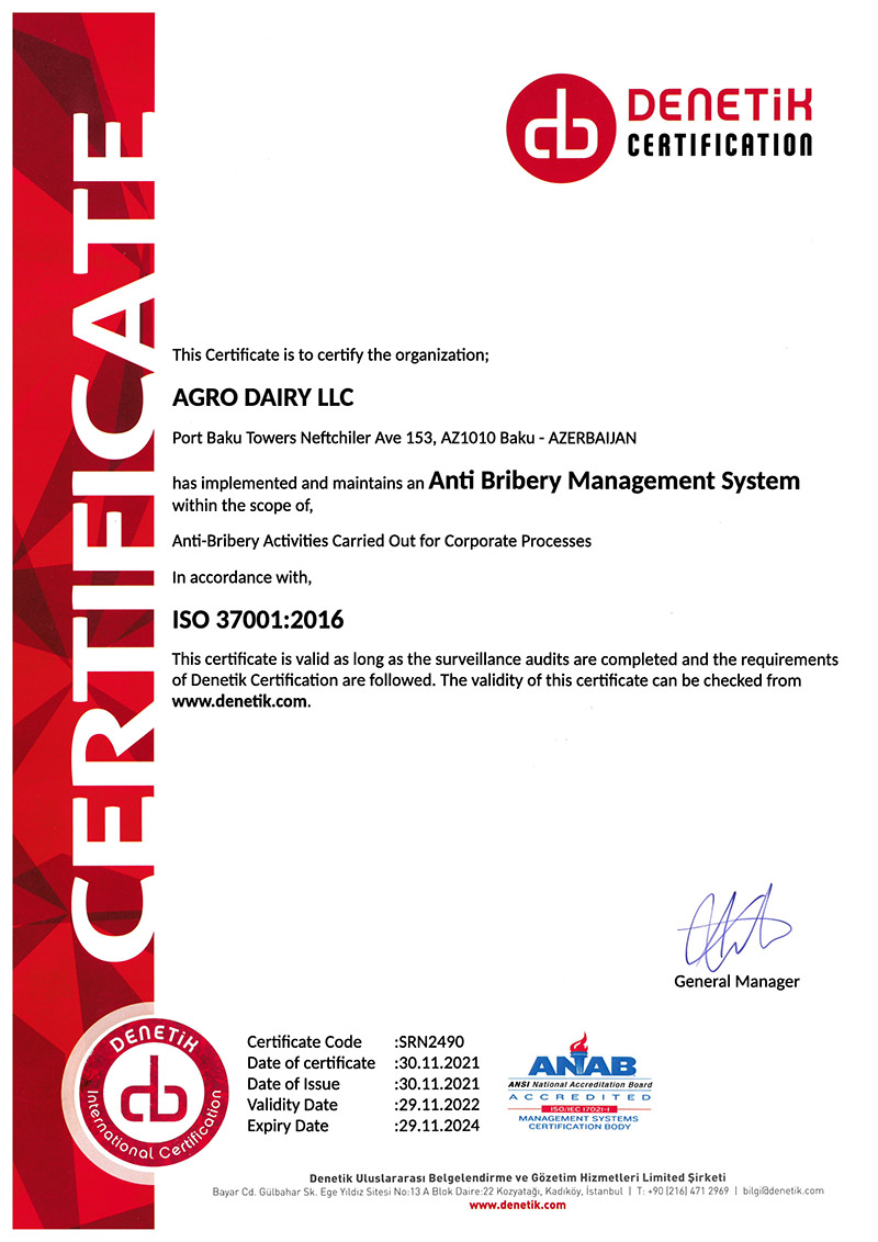 İSO 37001:2016 korrupsiyaya qarşı idarəetmə sistemi sertifikatıdır(®) Azərbaycanın kənd təsərrüfatı sahəsində iri və qabaqcıl şirkətlərindən olan “Agro Dairy” MMC ISO 37001:2016 “Korrupsiyaya qarşı idarəetmə sistemi” standartlarına uyğunluq sertifikatını əldə edərək, korporativ mədəniyyətin şirkət üçün böyük önəm daşıdığını nümayiş etdirmiş oldu.