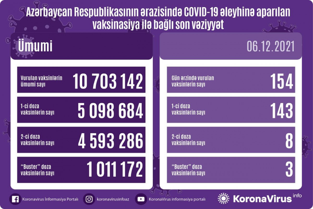 Azərbaycanda son sutkada koronavirus (COVID-19) əleyhinə 154 vaksin vurulub. Bir gündə birinci mərhələ üzrə vaksinasiya olunanların sayı 143, ikinci mərhələ üzrə vaksinasiya olunanların sayı 8, buster doza üzrə vaksinasiya olunanların sayı isə 3 nəfərdir.