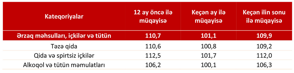 Qeyd edək ki, 2021-ci ilin noyabr ayında təzə qida məhsullarının (qısamüddətli istifadəyə yararlı istehlak məhsulları) qiymətində 2020-ci ilin noyabr ayına nisbətən 10,6%, qida və spirtsiz içkilərdə 12,5%, alkoqol və tütün məmulatlarında isə 6,2% artım müşahidə edilib.