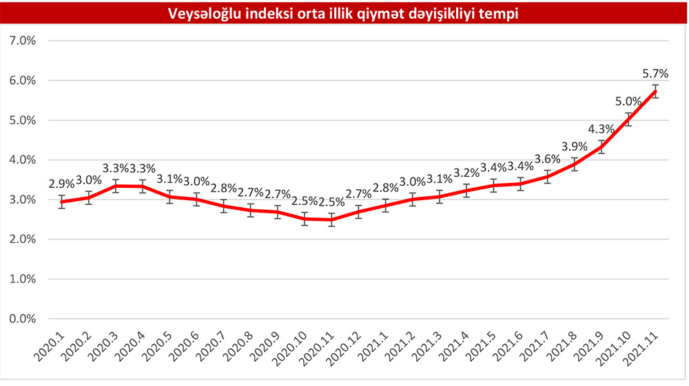 2021-ci ilin noyabr ayında “Veysəloğlu Pərakəndə İndeksi”nə daxil edilən məhsulların qiymətində 2020-ci ilin noyabr ayına nisbətən 10,7% artım olub.