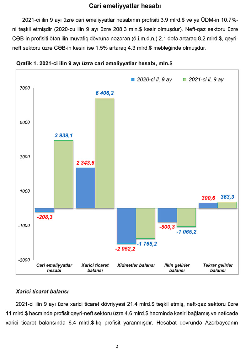 2021-ci ilin 9 ayı üzrə cari əməliyyatlar hesabının profisiti 3.9 milyard və ya ÜDM-in 10.7%- ni təşkil etmişdir (2020-cu ilin 9 ayı üzrə 208.3 milyard dollar kəsir olmuşdur). Neft-qaz sektoru üzrə cari əməliyyatlar hesabının profisiti ötən ilin müvafiq dövrünə nəzərən 2.1 dəfə artaraq 8.2 milyard dollar, qeyri-neft sektoru üzrə cari əməliyyatlar hesabının kəsiri isə 1.5% artaraq 4.3 milyard dollar məbləğində olmuşdur.