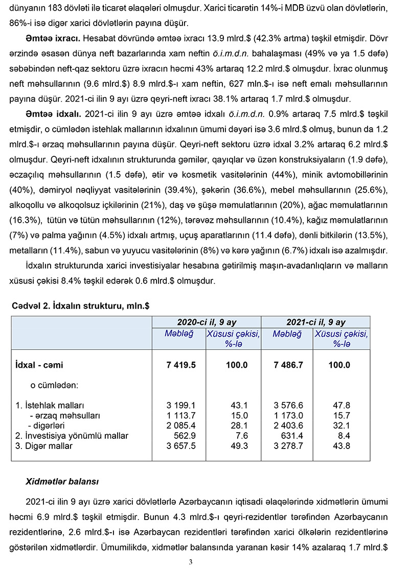 2021-ci ilin 9 ayı üzrə əmtəə idxalı ötən ilin müvafiq dövrünə nisbətən 0.9% artaraq 7.5 milyard dollar təşkil etmişdir, o cümlədən istehlak mallarının idxalının ümumi dəyəri isə 3.6 milyard dollar olmuş, bunun da 1.2 milyard dollarını ərzaq məhsullarının payına düşür. Qeyri-neft sektoru üzrə idxal 3.2% artaraq 6.2 milyard dollar olmuşdur. Qeyri-neft idxalının strukturunda gəmilər, qayıqlar və üzən konstruksiyaların (1.9 dəfə), əczaçılıq məhsullarının (1.5 dəfə), ətir və kosmetik vasitələrinin (44%), minik avtomobillərinin (40%), dəmiryol nəqliyyat vasitələrinin (39.4%), şəkərin (36.6%), mebel məhsullarının (25.6%), alkoqollu və alkoqolsuz içkilərinin (21%), daş və şüşə məmulatlarının (20%), ağac məmulatlarının (16.3%), tütün və tütün məhsullarının (12%), tərəvəz məhsullarının (10.4%), kağız məmulatlarının (7%) və palma yağının (4.5%) idxalı artmış, uçuş aparatlarının (11.4 dəfə), dənli bitkilərin (13.5%), metalların (11.4%), sabun və yuyucu vasitələrinin (8%) və kərə yağının (6.7%) idxalı isə azalmışdır. İdxalın strukturunda xarici investisiyalar hesabına gətirilmiş maşın-avadanlıqların və malların xüsusi çəkisi 8.4% təşkil edərək 0.6 milyard dollar olmuşdur.