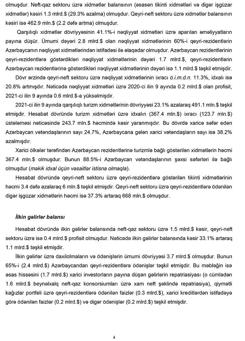 2021-ci ilin 9 ayında qarşılıqlı turizm xidmətlərinin dövriyyəsi 23.1% azalaraq 491.1 milyon dollar təşkil etmişdir. Hesabat dövründə turizm xidmətləri üzrə idxalın (367.4 milyon dollar) ixracı (123.7 milyon dollar) üstələməsi nəticəsində 243.7 milyon dollar həcmində kəsir yaranmışdır. Bu dövrdə xaricə səfər edən Azərbaycan vətəndaşlarının sayı 24.7%, Azərbaycana gələn xarici vətəndaşların sayı isə 38.2% azalmışdır. Xarici ölkələr tərəfindən Azərbaycan rezidentlərinə turizmlə bağlı göstərilən xidmətlərin həcmi 367.4 milyon dollar olmuşdur. Bunun 88.5%-i Azərbaycan vətəndaşlarının şəxsi səfərləri ilə bağlı olmuşdur (məkik idxal üçün vəsaitlər istisna olmaqla). Hesabat dövründə qeyri-neft sektoru üzrə qeyri-rezidentlərə göstərilən tikinti xidmətlərinin həcmi 3.4 dəfə azalaraq 6 milyon təşkil etmişdir. Qeyri-neft sektoru üzrə qeyri-rezidentlərə ödənilən digər işgüzar xidmətlərin həcmi isə 37.3% artaraq 668 milyon olmuşdur.