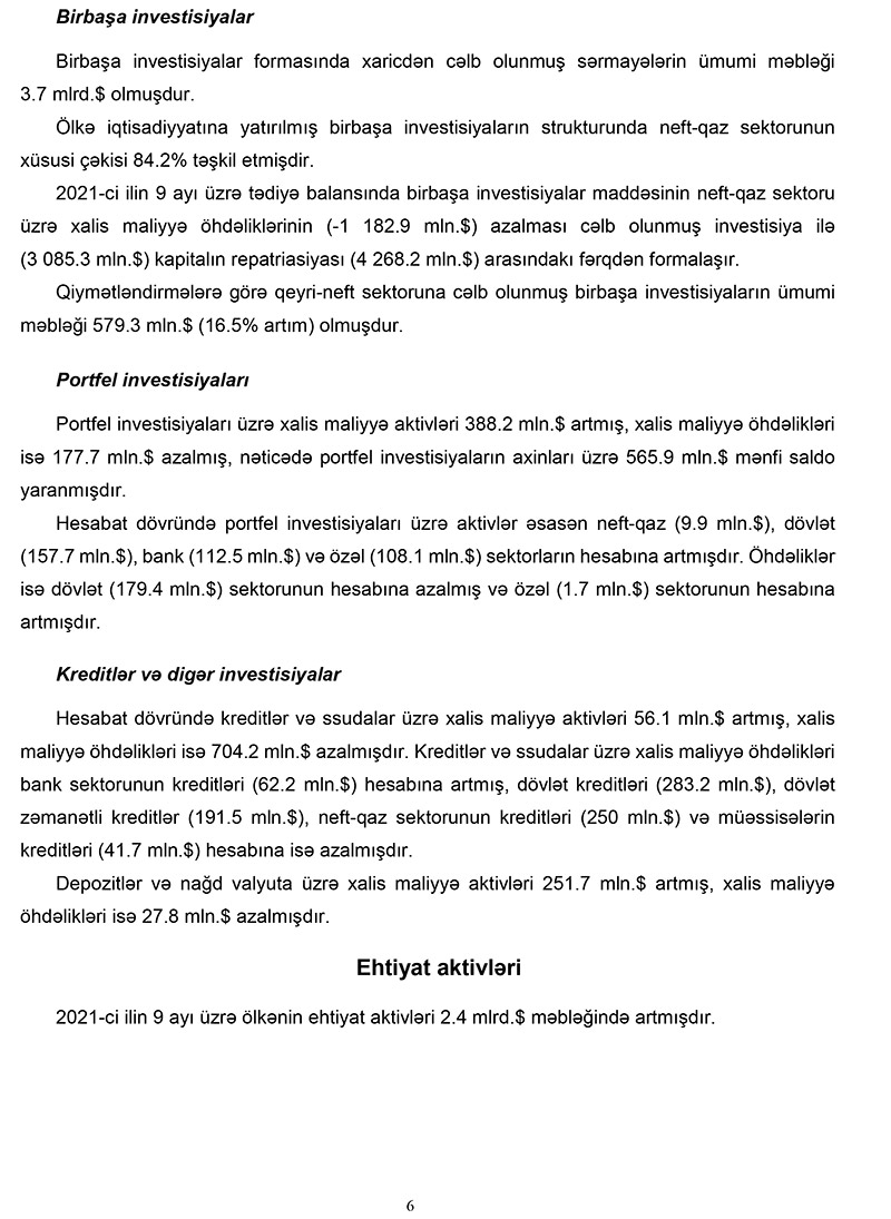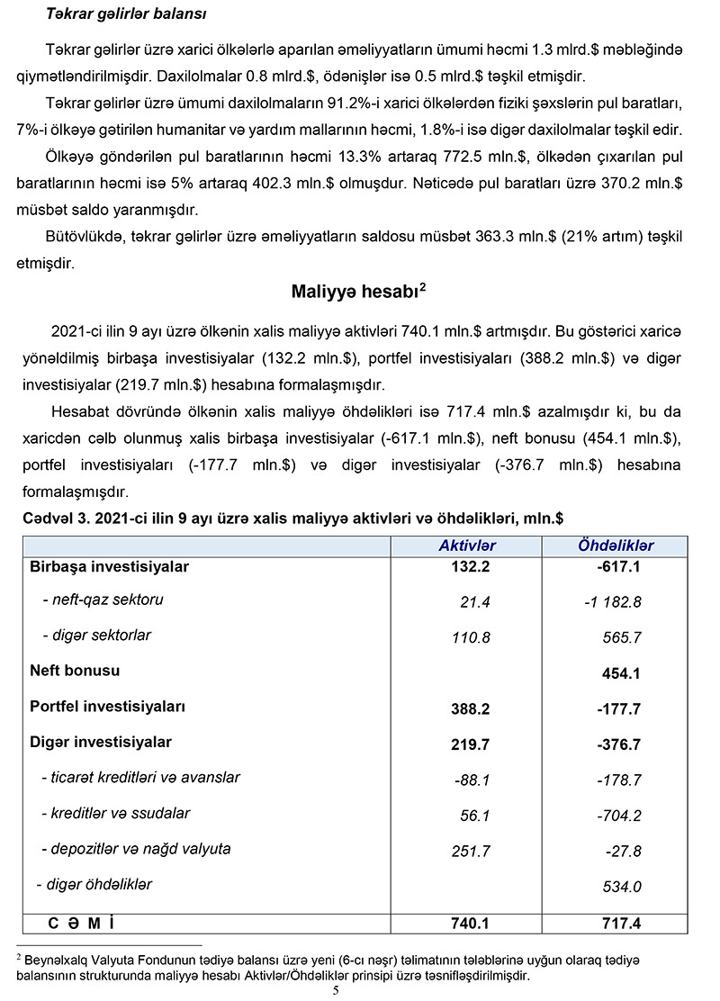 2021-ci ilin 9 ayı üzrə ölkənin xalis maliyyə aktivləri 740.1 mln.$ artmışdır. Bu göstərici xaricə yönəldilmiş birbaşa investisiyalar (132.2 mln.$), portfel investisiyaları (388.2 mln.$) və digər investisiyalar (219.7 mln.$) hesabına formalaşmışdır. Hesabat dövründə ölkənin xalis maliyyə öhdəlikləri isə 717.4 mln.$ azalmışdır ki, bu da xaricdən cəlb olunmuş xalis birbaşa investisiyalar (-617.1 mln.$), neft bonusu (454.1 mln.$), portfel investisiyaları (-177.7 mln.$) və digər investisiyalar (-376.7 mln.$) hesabına formalaşmışdır.