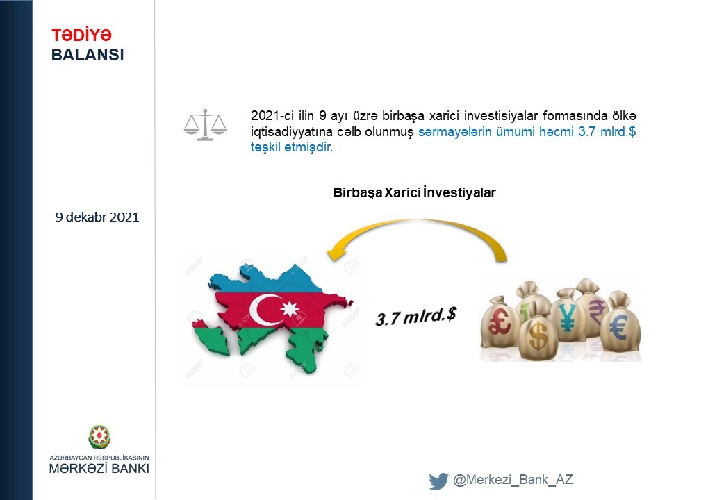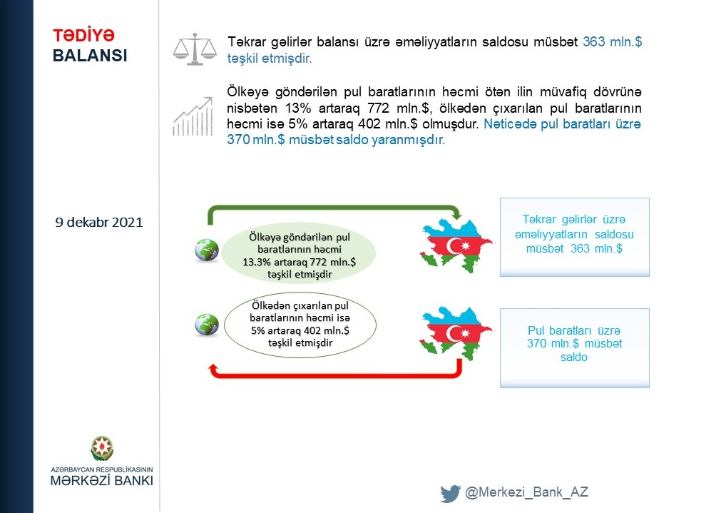 Azərbaycanın tədiyə balansının saldosu 1 milyard 803.7 milyon dollar kəsirdən, 2 milyard 437 milyon dollar profisitə keçib.2021-ci ilin 9 ayında Azərbaycanın tədiyə balansının ümumi saldosu müsbət 2 milyard 437 milyon dollar təşkil edib. Müqayisə üçün qeyd edək ki, 2020-ci ilin 9 ayında tədiyə balansının ümumi saldosu mənfi 1 milyard 803.7 milyon dollar təşkil etmişdi.