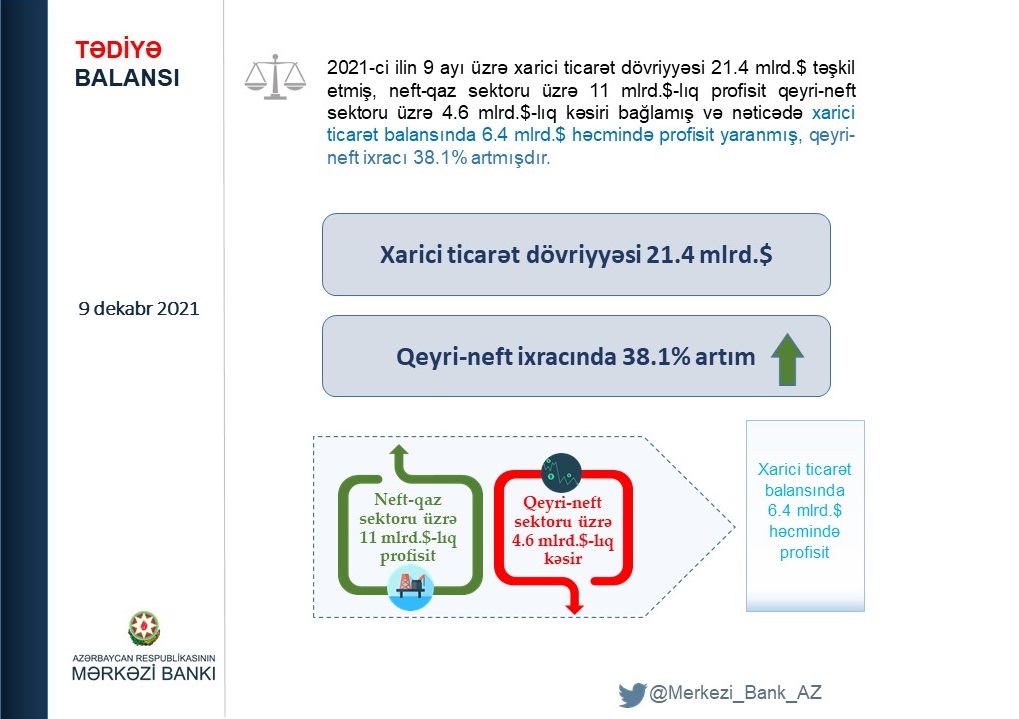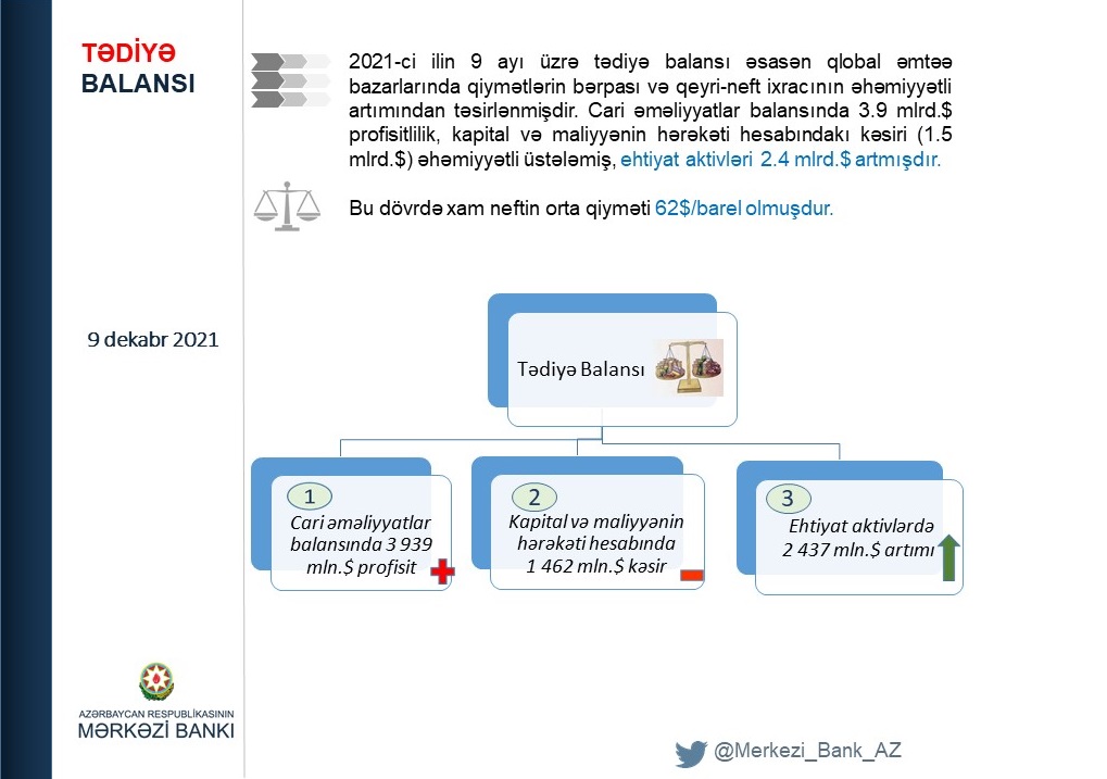 Marja.az Mərkəzi Banka istinadən xəbər verir ki, 2021-ci ilin 9 ayında tədiyə balansı əsasən qlobal əmtəə bazarlarında qiymətlərin bərpası və qeyri-neft ixracının əhəmiyyətli artımından təsirlənmişdir.