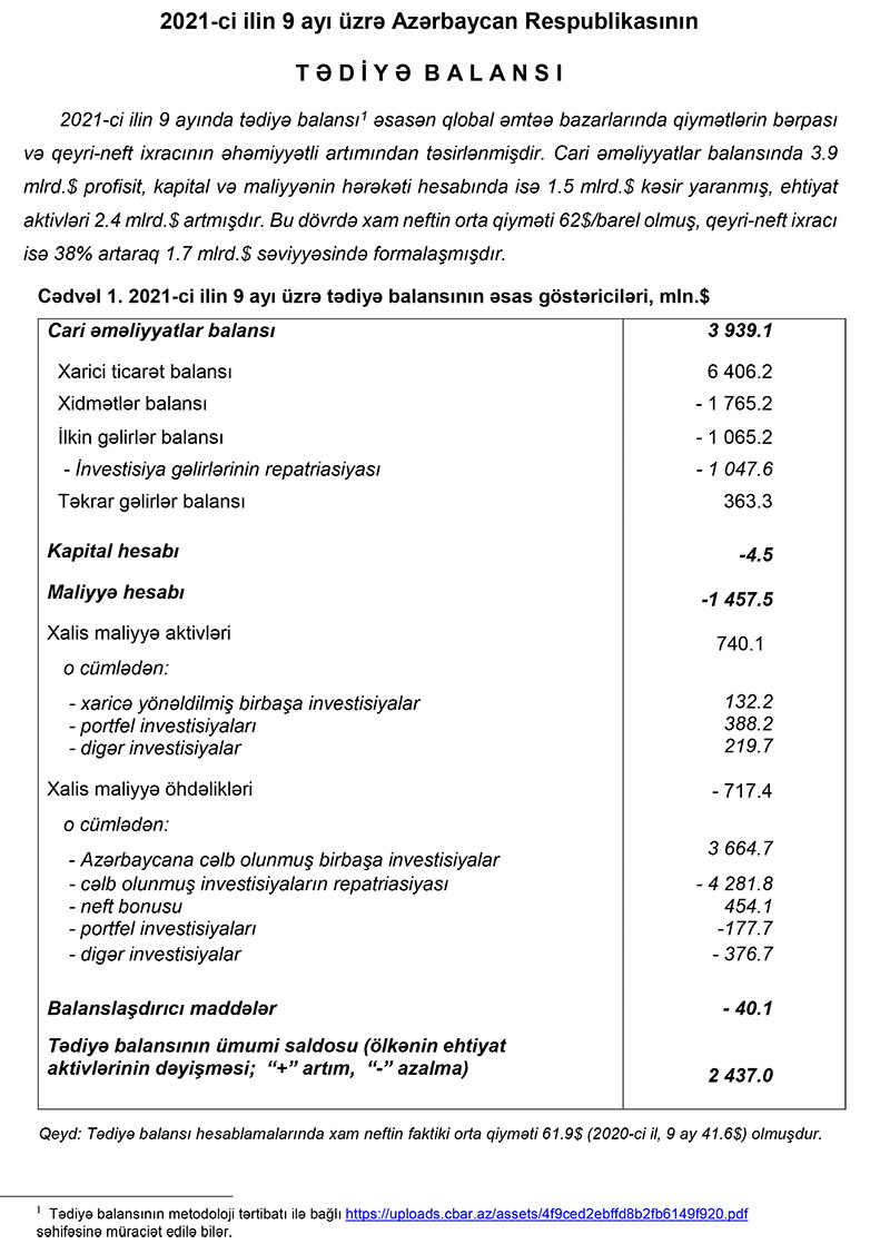 Tədiyyə balansında qeyd edilib ki, 2021-ci ilin 9 ayı üzrə tədiyə balansında birbaşa investisiyalar maddəsinin neft-qaz sektoru üzrə xalis maliyyə öhdəliklərinin (-1 milyard 182.9 milyon dollar) azalması cəlb olunmuş investisiya ilə (3 milyard 85.3 milyon dollar) kapitalın repatriasiyası (4 milyard 268.2 milyon dollar) arasındakı fərqdən formalaşır.