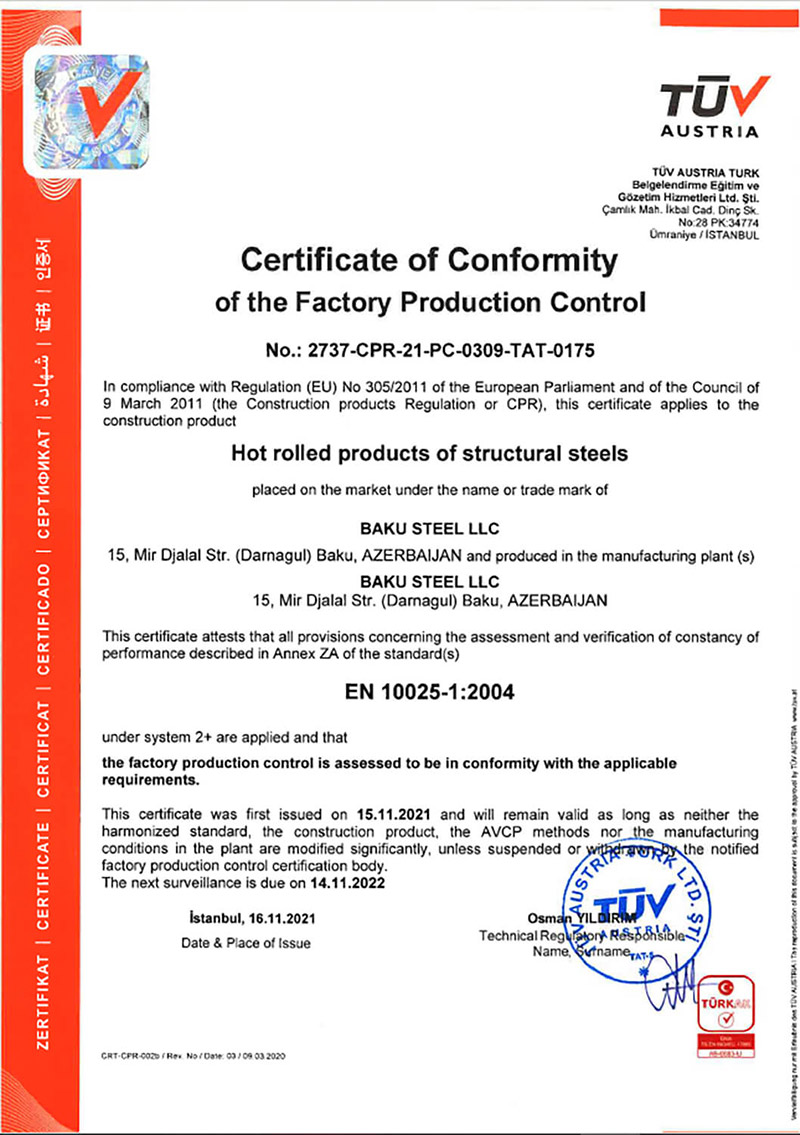 Bir neçə gün əvvəl “Baku Steel Company”yə armatur, kvadrat və dairəvi pəstahların istehsalı keyfiyyətini təsdiq edən EN 10080:2005, EN 10025-1:2004 də DIN 17100:1980, bir neçə ay öncə isə ASTM A615/A615M-20, ASTM A706/ A706M-16, həmçinin boruların keyfiyyətinə görə EN 10210-1:2006 və ГОСT 31446-2017 beynəlxalq sertifikatları (https://www.bakusteel.com/az/biz-kimik/sertifikatlar/ ) təqdim olunub.