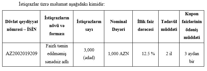Birja-dan Marja-ya daxil olmuş məlumata görə, yerləşdiriləcək istiqrazların sayı 3 min ədəd, nominal dəyəri 1 min manat, illik faiz dərəcəsi 12,5%, tədavül müddəti 2 il, kupon faizlərinin ödəniş müddəti 3 aydan birdir.