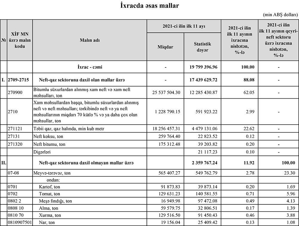 2021-ci ilin yanvar-noyabr aylarında (11 ayda) Azərbaycanın ən çox ixrac və idxal etdiyi mallar açıqlanıb.