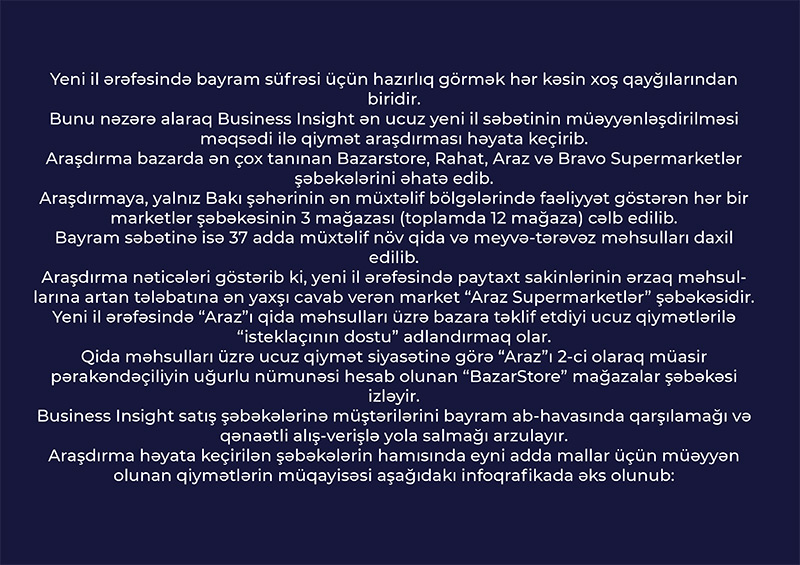 Yeni il ərəfəsində bayram süfrəsi üçün hazırlıq görmək hər kəsin xoş qayğılarından biridir. Bunu nəzərə alaraq “Business Insight” ən ucuz yeni il səbətinin müəyyənləşdirilməsi məqsədi ilə qiymət araşdırması həyata keçirib.