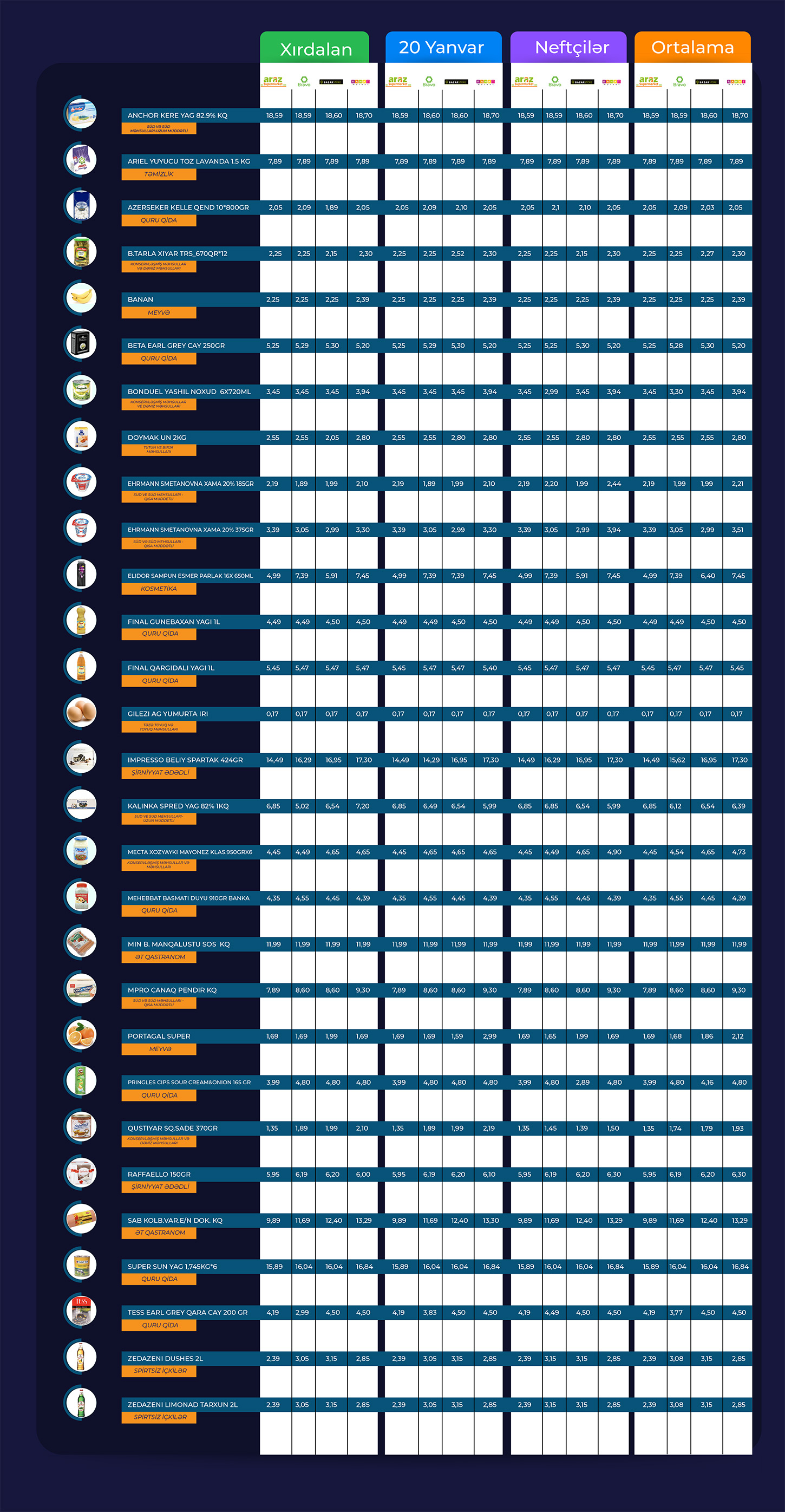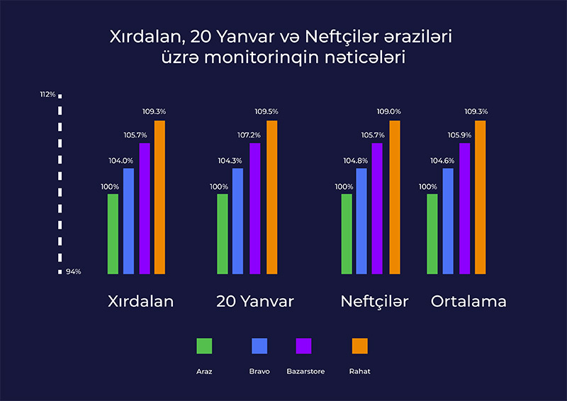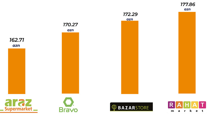 Araşdırma həyata keçirilən şəbəkələrin hamısında eyni adda mallar üçün müəyyən olunan qiymətlərin müqayisəsi aşağıdakı infoqrafikada əks olunub: