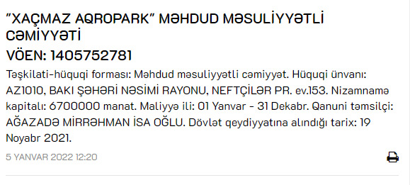 "Xaçmaz Aqropark" şirkətinin hüquqi ünvanı Bakı, Nəsimi rayonu, Neftçilər pr ev.153-dür (Port Baku).
