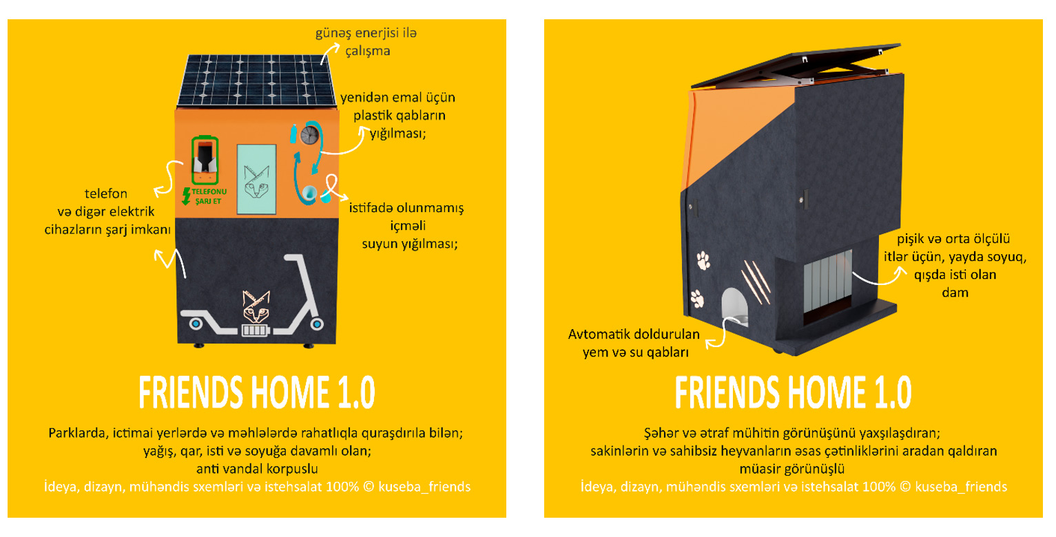 “Friend's Home 1.0” layihəsi “Ağıllı şəhər” konsepsiyası çərçivəsində zəruri şəhər infrastrukturunun yaradılmasına yönəlib. Söhbət günəş enerjisi ilə çalışan ağıllı cihazdan gedir. Cihaz sahibsiz heyvanları yem, su və sığınacaqla təmin etməklə yanaşı həm də parklarda, meydanlarda, həyətlərdə və digər ictimai yerlərdə quraşdırıla bilər.