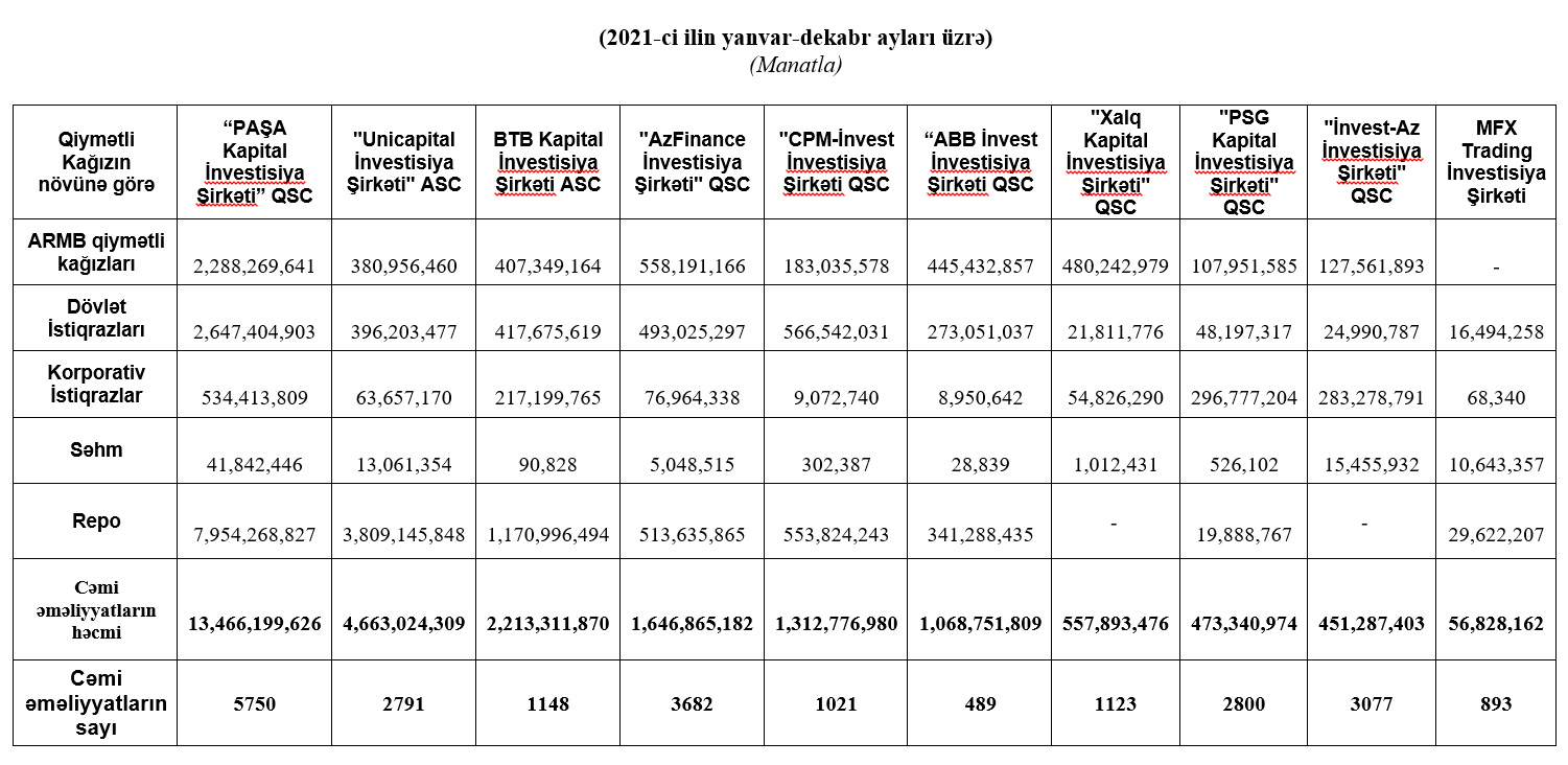 Marja Birjaya istinadən xəbər verir ki, ötən il dövriyyə üzrə “PAŞA Kapital İnvestisiya Şirkəti” QSC 1-ci, "Unicapital İnvestisiya Şirkəti" ASC 2-ci, "BTB Kapital İnvestisiya Şirkəti" ASC 3-cü yeri tutub.
