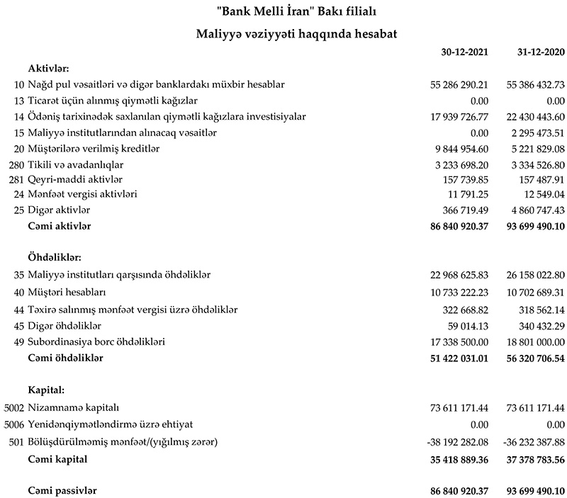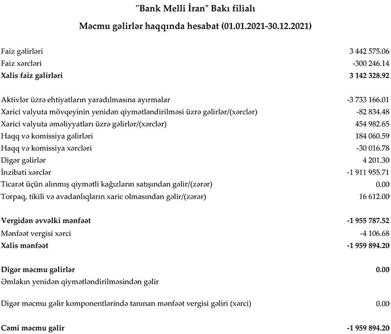 "Bank Melli İran" Bakı filialı 2021-ci ili 1 milyon 960 min manat xalis zərər ilə başa vurub.