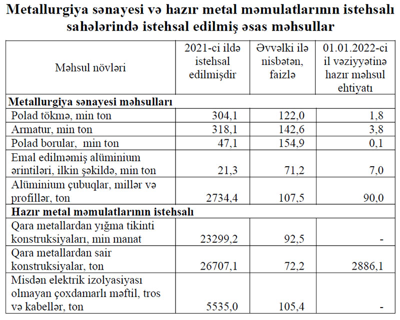 Metallurgiya sənayesi və hazır metal məmulatlarının istehsalı sahələrində 2021-ci ildə 1141,8 milyon manatlıq məhsul istehsal olunmuş, hazır metal məmulatlarının istehsalı sahəsində 17,4 faiz, metallurgiya sənayesi məhsullarının istehsalında isə 16,9 faiz artım müşahidə olunmuşdur. 2021-ci ildə hazır metal məmulatlarının istehsalı sahəsi üzrə 26 min 707,1 ton qara metallardan sair konstruksiyalar istehsal edilmiş, metaldan sair məmulatların istehsalı isə 7,2 dəfə artmışdır.