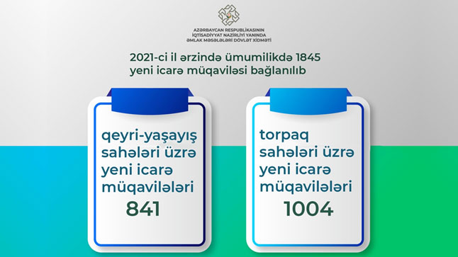 Daşınmaz dövlət əmlakının səmərəli istifadə edilməsi və icarədən yayınmış obyektlərin icarəyə cəlb edilməsi məqsədilə aparılmış nəzarət və maarifləndirmə tədbirləri nəticəsində icarə bazasının genişləndirilməsinə nail olunub və bağlanılmış icarə müqavilələrinin sayında artım qeydə alınıb. Belə ki, 2021-ci il ərzində ümumilikdə 1845 yeni icarə müqaviləsi bağlanılıb. Bundan 841-i qeyri-yaşayış sahələri üzrə, 1004-ü isə torpaq sahələrinə dair olub.