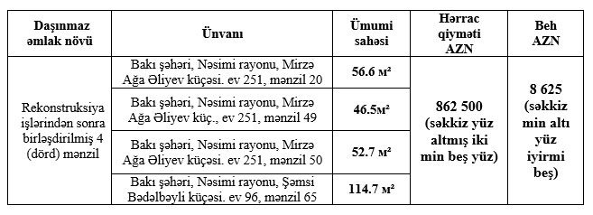 Ləğv prosesində olan “Standard Insurance” sığorta şirkətinin ləgvetmə komissiyası tərəfindən şirkətə məxsus rekonstruksiya işlərindən sonra birləşdirilmiş 4 (dörd) mənzil onların ümumilikdə satış qiyməti olan 1 milyon 150 min manatdan 25% aşağı olmaqla, yəni 862 min 500 manata təkrar açıq hərraca çıxarılacaqdır.