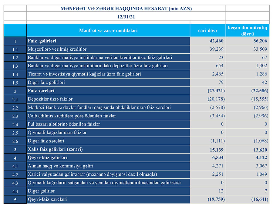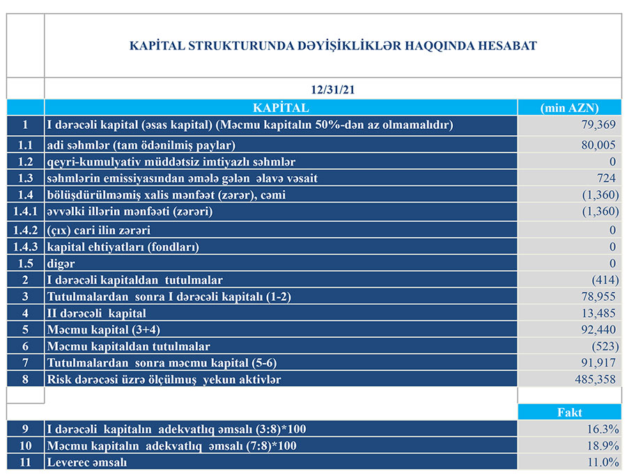 31 dekabr 2021-ci il tarixində 91 milyon 917 min manat manat məcmu kapitala malik olub. Bank 31 dekabr 2020-ci il tarixində 82 milyon 215 min manat cəmi kapitala malik idi.