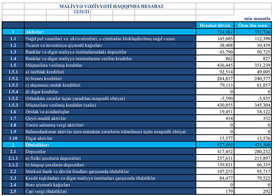 "Turanbank" ASC 2021-ci il üzrə maliyyə göstəricilərini açıqlayıb.