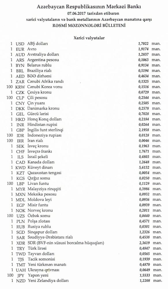 İyunun 7-na Mərkəzi Bankın açıqladığı rəsmi Dollar/manat məzənnəsi İyunun 6-sı ilə müqayisədə qalxaraq 1,7022 manat olub, Avro/manat məzənnəsi isə 1.9174 manata düşüb.