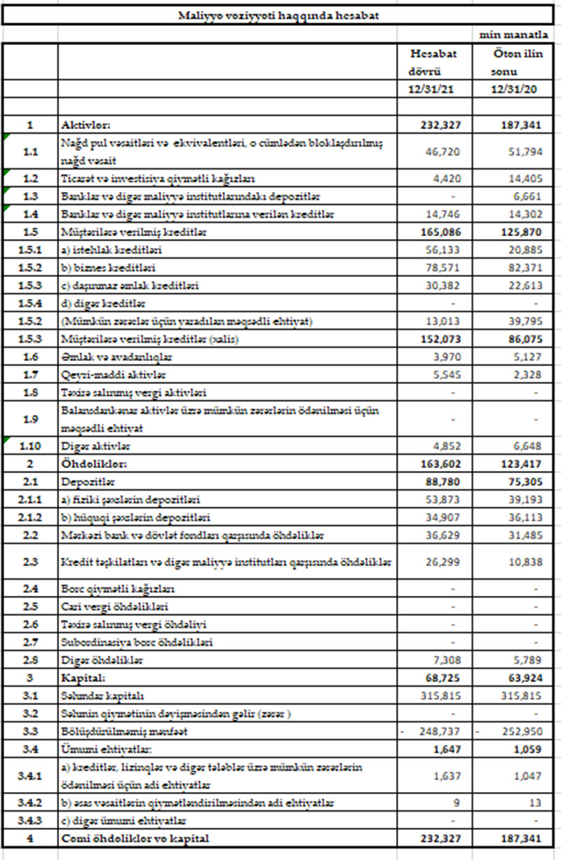 Hesabat dövrünün sonuna bankın öhdəlikləri 163 milyon 602 min manat (32,6% artım), depozit portfeli 88 milyon 780 min manat (17,9% artım), o cümlədən fiziki şəxslərin əmanətləri 53 milyon 873 min manat təşkil edir (37,5% artım).