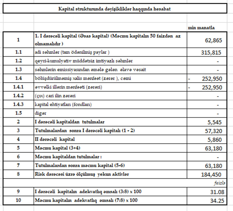2022-ci ilin əvvəlinə bankın kapitalı 68 milyon 725 min manat (artım 7,5%), nizamnamə kapitalı 315 milyon 815 min manat (dəyişməyib) təşkil edib.