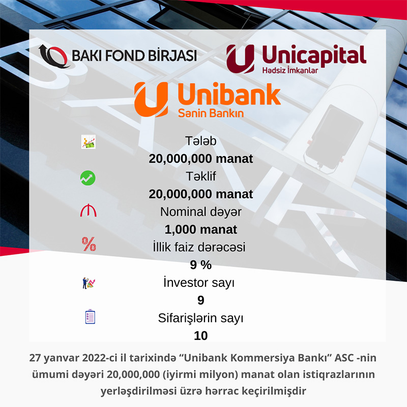 27 yanvar 2022-ci il tarixində Bakı Fond Birjasında “Unibank Kommersiya Bankı” ASC-nin premium bazar seqmentində olan, tədavül müddəti 18 təqvim ayı olan AZ2013002020 dövlət qeydiyyat nömrəli, 20 milyon manat həcmində, faizli, təmin edilməmiş sənədsiz, adlı istiqrazlarının yerləşdirilməsi üzrə hərrac yekunlaşıb.
