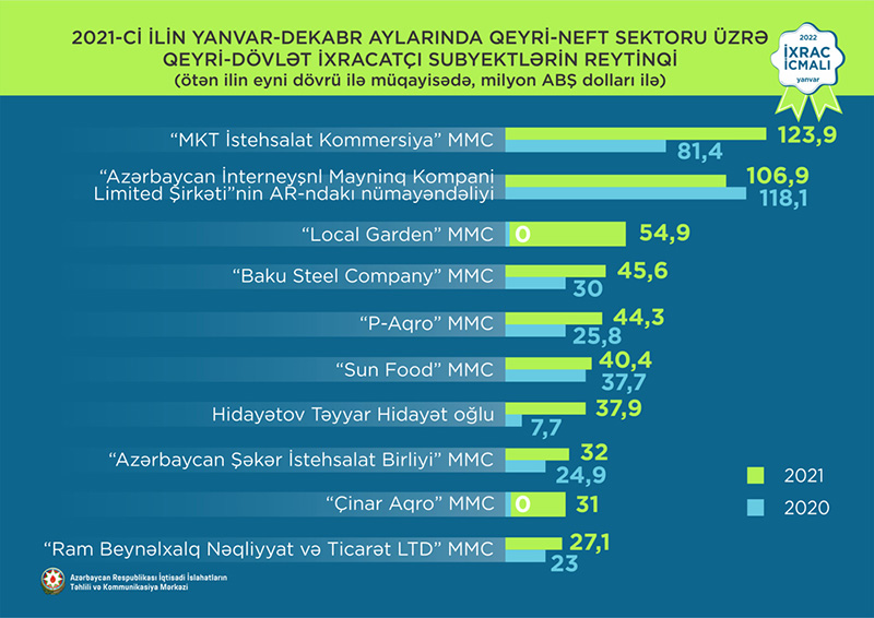 2021-ci ilin dekabr ayında ixrac edilən qeyri-neft sektoruna aid malların siyahısında xurma (34,4 milyon ABŞ dolları) birinci, polimerləşmə nəticəsində əmələ gələn ilkin formalı digər maddələr (26,9 milyon ABŞ dolları) ikinci və karbamid (25,1 milyon ABŞ dolları) üçüncü olub.