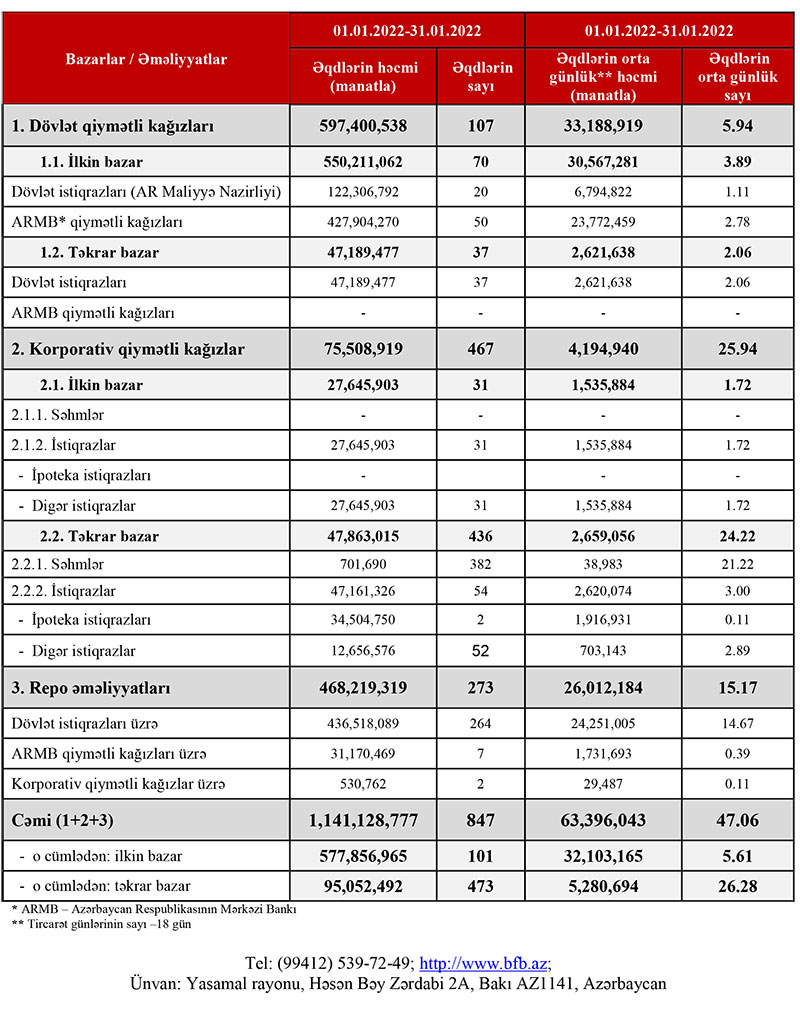 Bakı Fond Birjasında 2022-ci ilin yanvar ayı ərzində qiymətli kağızlar üzrə keçirilən əməliyyatların ümumi həcmi 1 milyard 141 milyon 128 min 777 manat təşkil etdib.