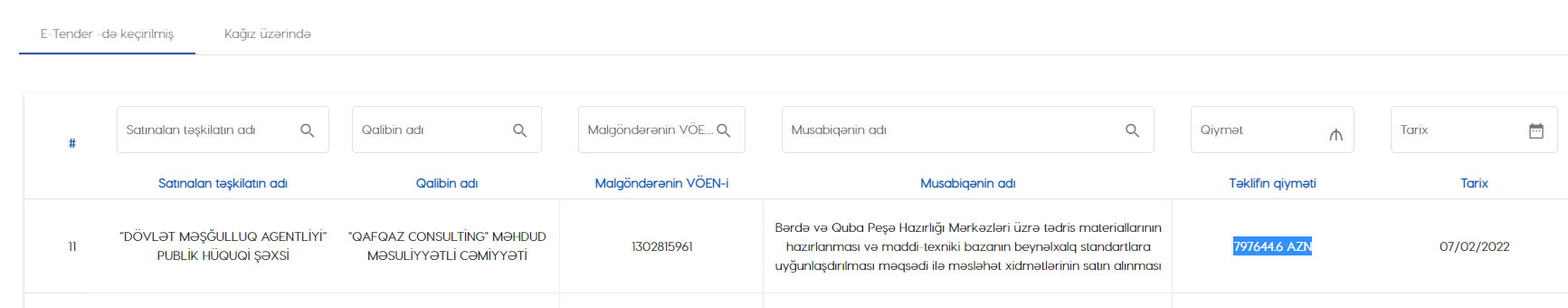 Dövlət Məşğulluq Agentliyi "Bərdə və Quba Peşə Hazırlığı Mərkəzləri üzrə tədris materiallarının hazırlanması və maddi-texniki bazanın beynəlxalq standartlara uyğunlaşdırılması məqsədi ilə məsləhət xidmətlərinin satın alınması" üçün keçirdiyi tenderi yekunlaşdırıb.