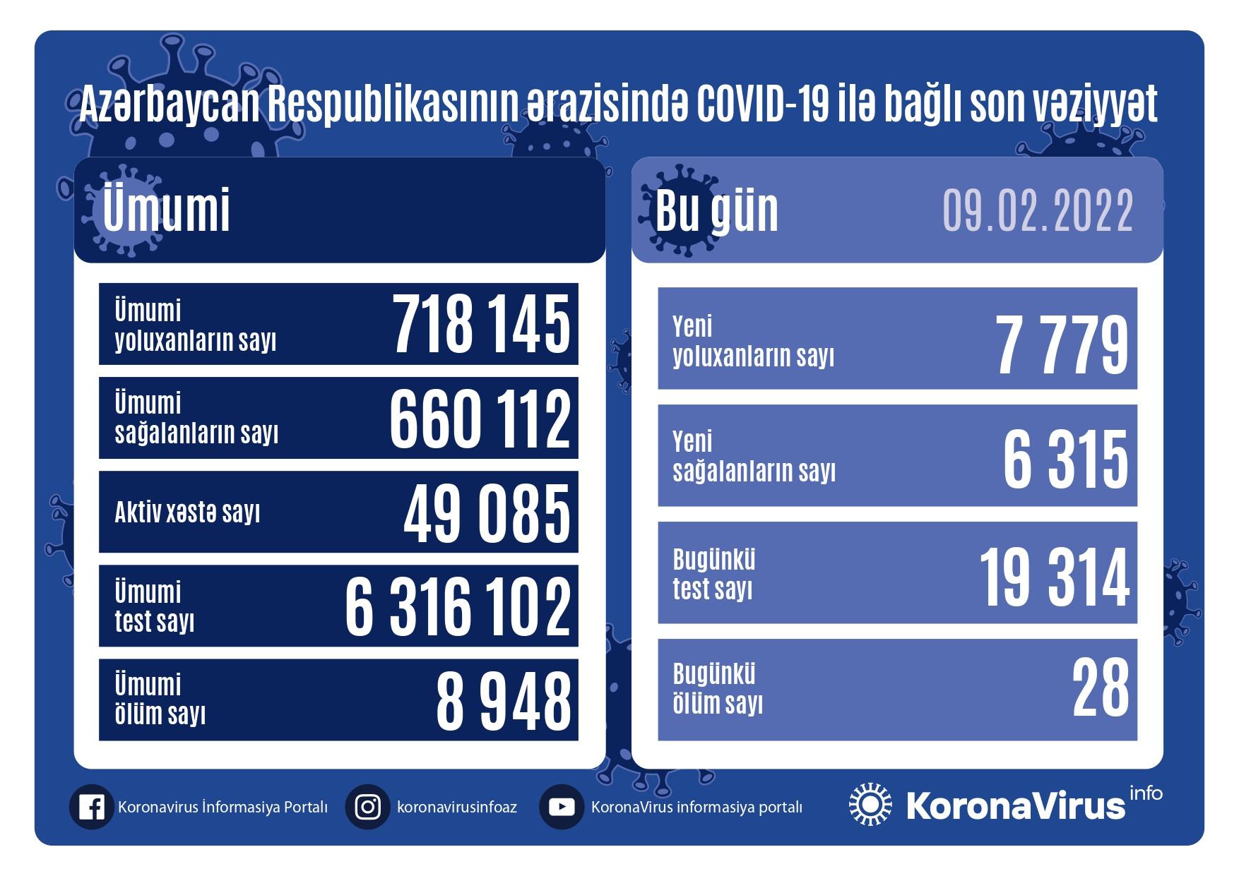 Azərbaycanda koronavirus (COVID-19) infeksiyasına 7779 yeni yoluxma faktı qeydə alınıb, 6 315 nəfər müalicə olunaraq sağalıb.