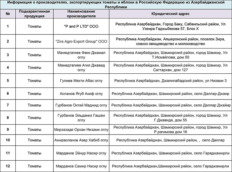Решение принято по итогам проведенного Агентством пищевой безопасности Азербайджанской Республики фитосанитарного мониторинга предприятий, выращивающих томаты и яблоки на территории страны, изучения азербайджанскими коллегами протоколов лабораторных испытаний и актов мониторинга, а также под гарантии компетентного ведомства Республики.