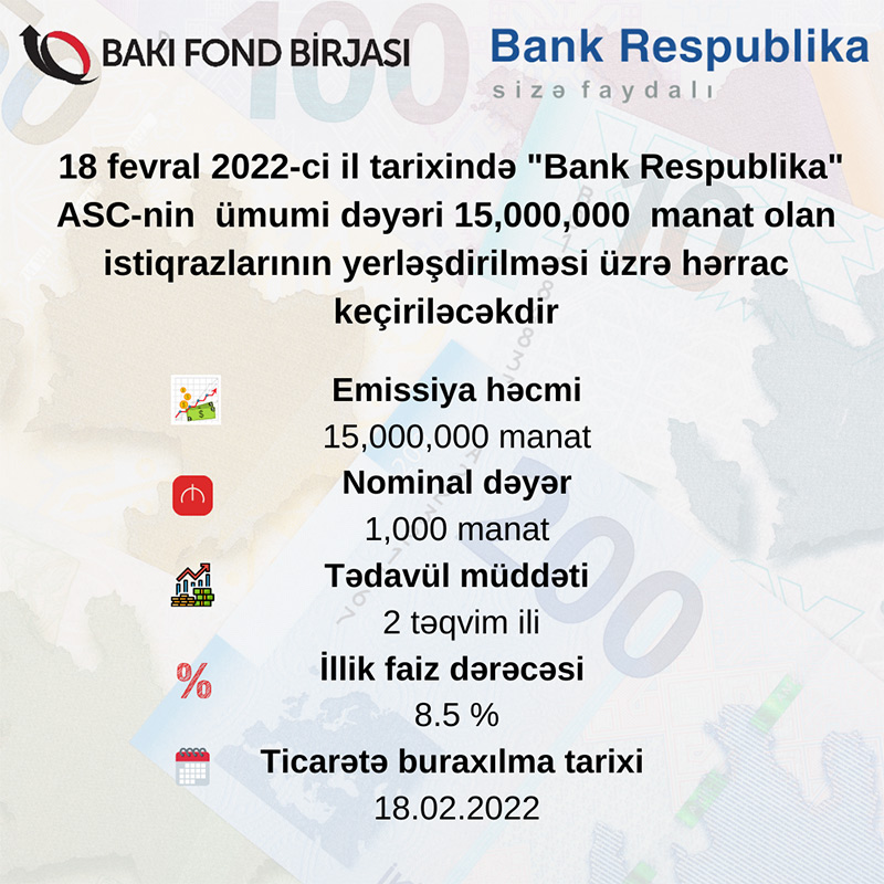 Birjanın yaydığı məlumata görə, 18 fevral 2022-ci il tarixində "Bank Respublika" ASC-nin istiqrazlarının yerləşdirilməsi Bakı Fond Birjasında rəqabətli hərrac üsulu ilə həyata keçiriləcəkdir.