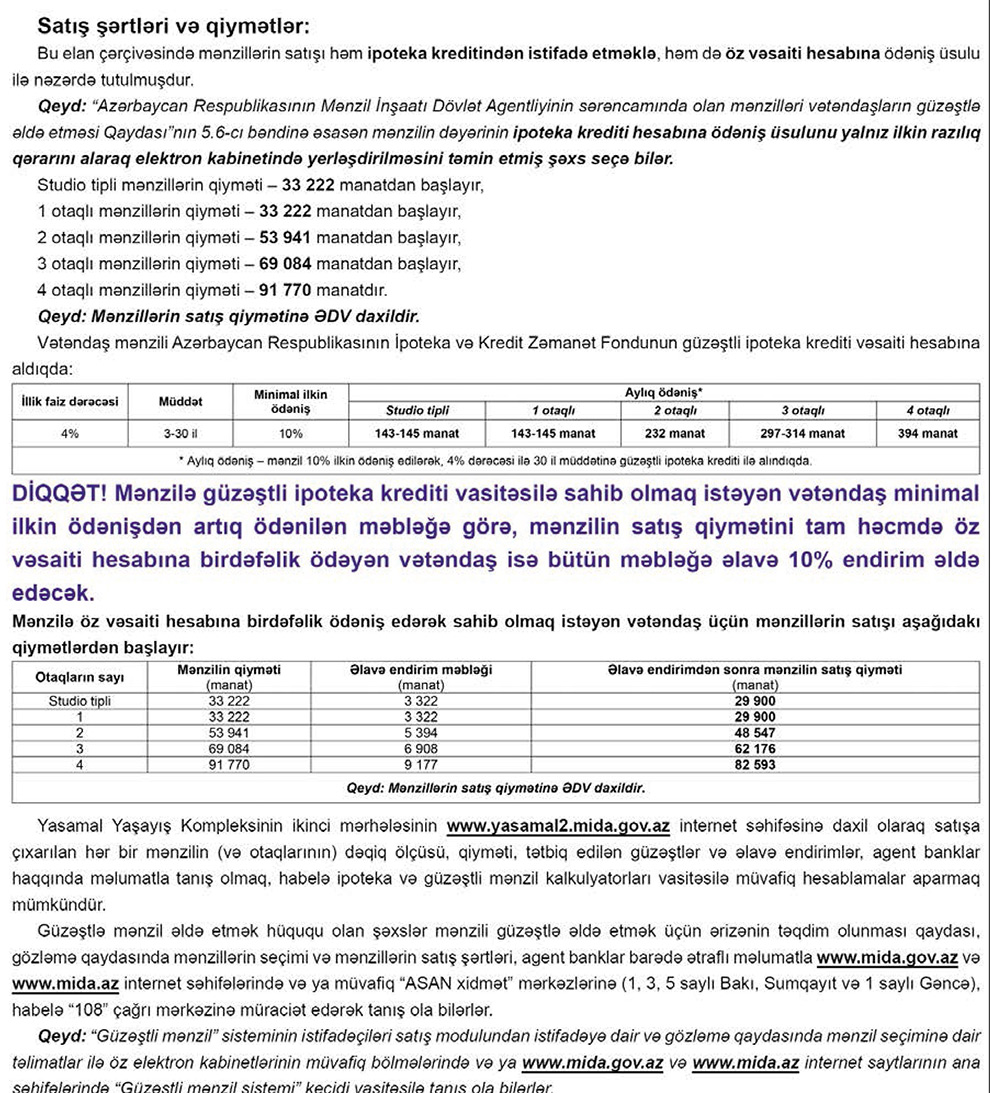 Qeyd edək ki, Azərbaycan Respublikası Prezidentinin 16 noyabr 2016-cı il tarixli 1113 nömrəli Fərmanına əsasən Mənzil İnşaatı Dövlət Agentliyinin sərəncamında olan mənzillərin əldə edilməsi “Elektron hökumət” portalı üzərində (www.e-gov.az) “Güzəştli mənzil” sistemi vasitəsilə elektron qaydada həyata keçirilir.