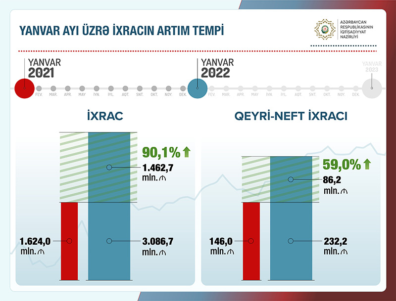 Yanvar ayında ixrac ötən ilin müvafiq dövrü ilə müqayisədə 90,1%, qeyri-neft sektoru üzrə ixrac isə 59% artıb.