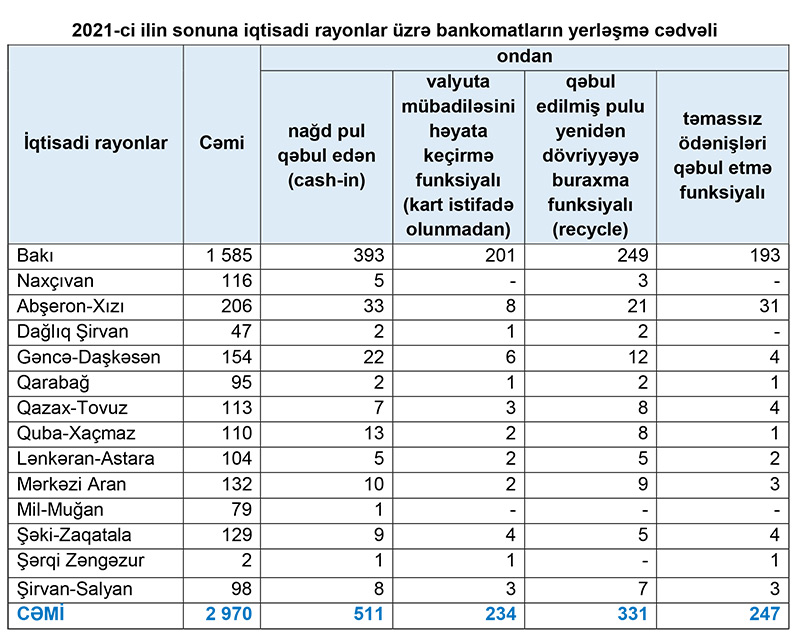 01.01.2022-ci il tarixinə ölkədə quraşdırılmış bankomatların sayı 2970 ədəd olmuşdur və son 1 il ərzində bankomatların sayında 6.9% artım müşahidə edilmişdir.