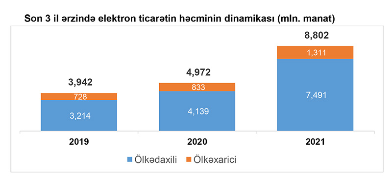 Ölkədə bank kartları ilə aparılan nağdsız ödənişlərin böyük hissəsi elektron ticarət əməliyyatlarının payına düşmüşdür. 2021-ci ilərzində elektron ticarət əməliyyatlarının sayı 2020-ci il ilə müqayisədə 57.5% artaraq 110 mln. ədəd, həcmi isə 81% artaraq 7.5 mlrd. manat olmuşdur.